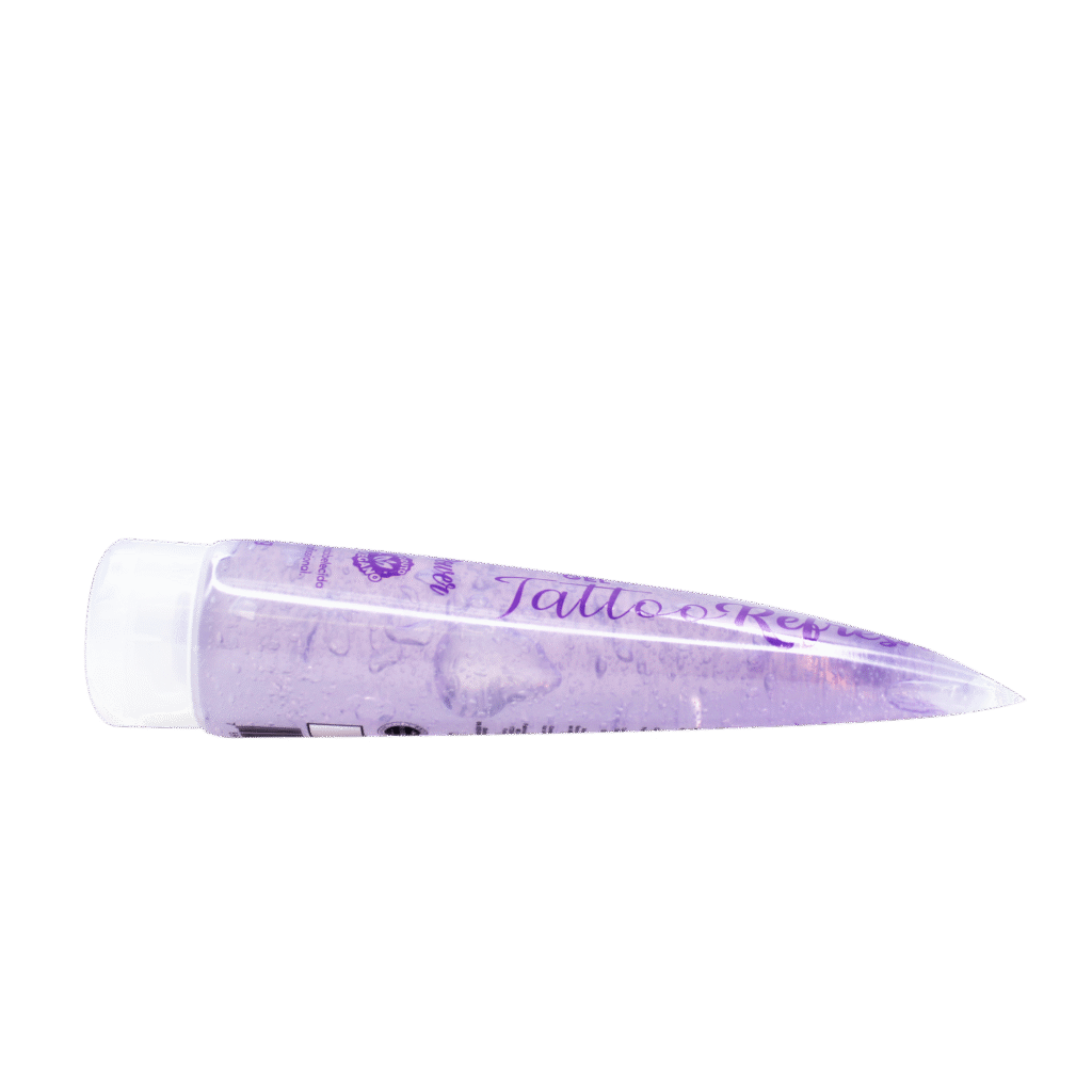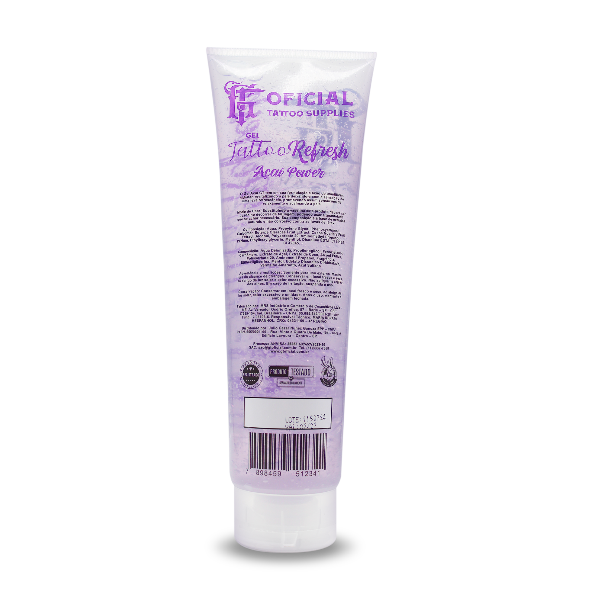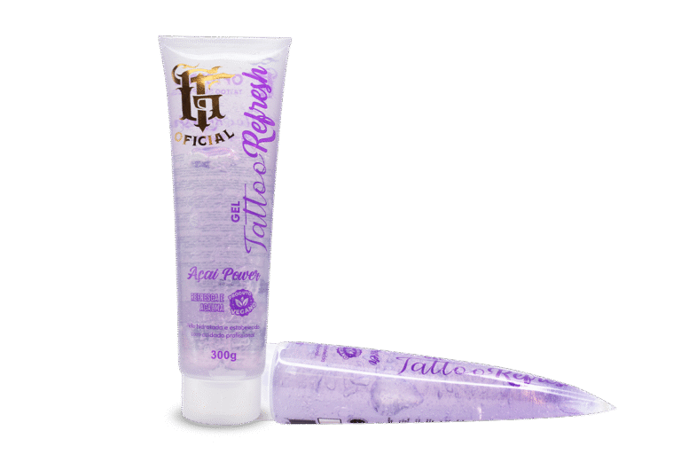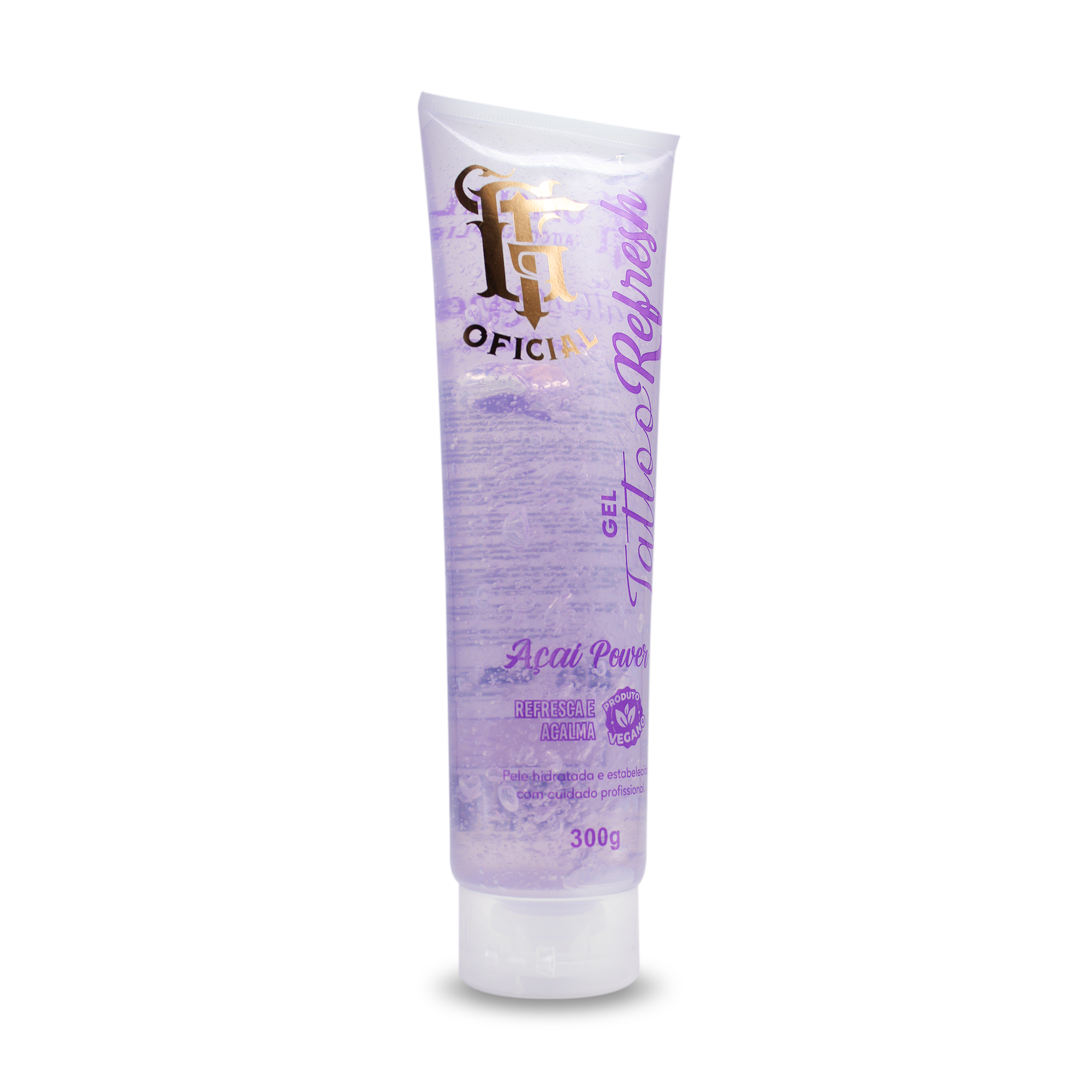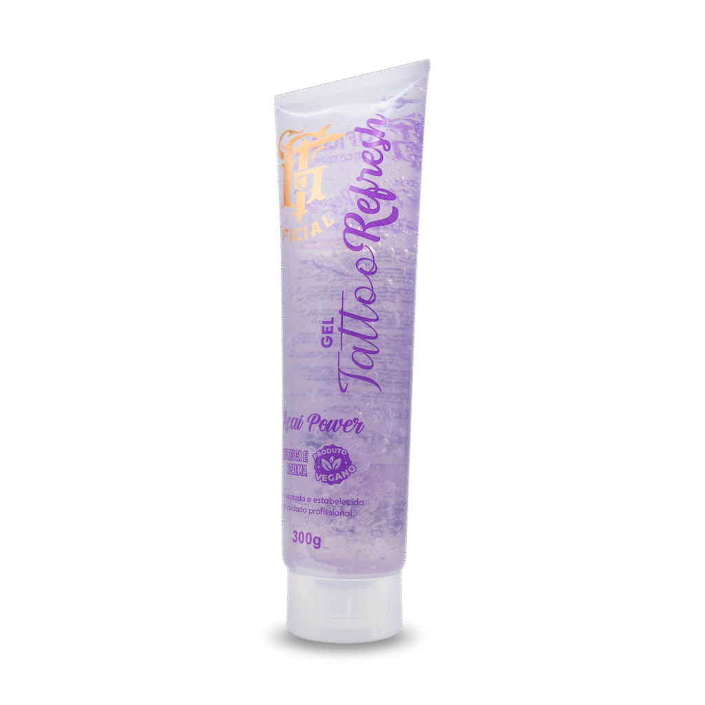 Gel refrescante com extrato de açaí, aloe vera e pantenol, acalma, hidrata e auxilia na recuperação da pele, proporcionando conforto durante e após a tatuagem.
