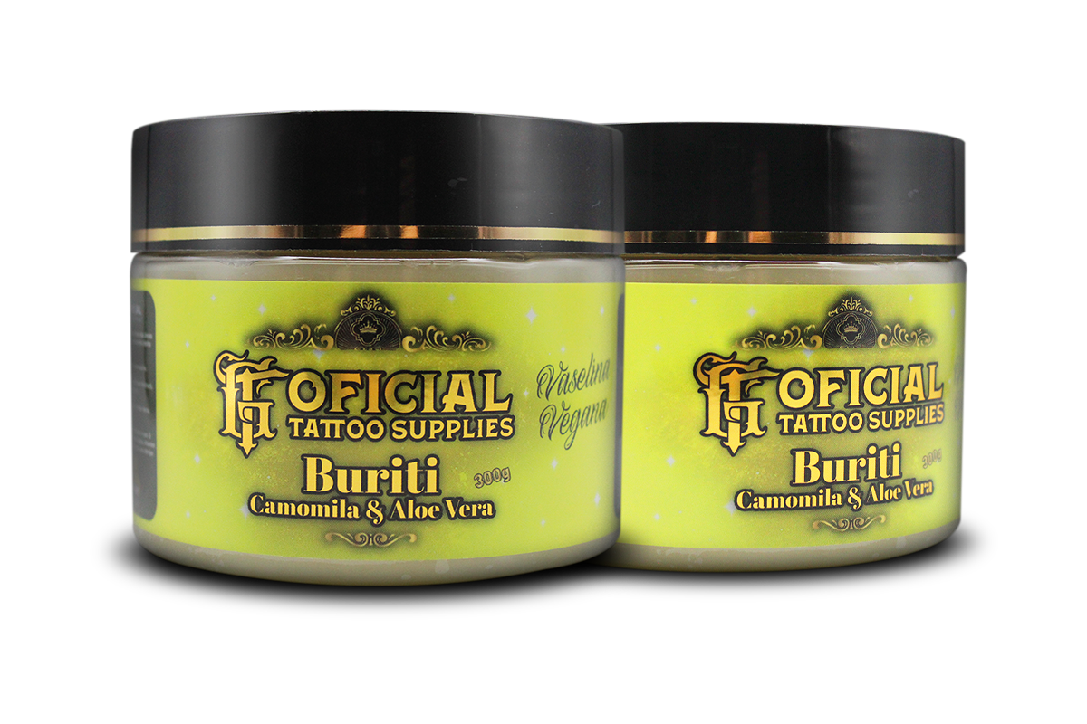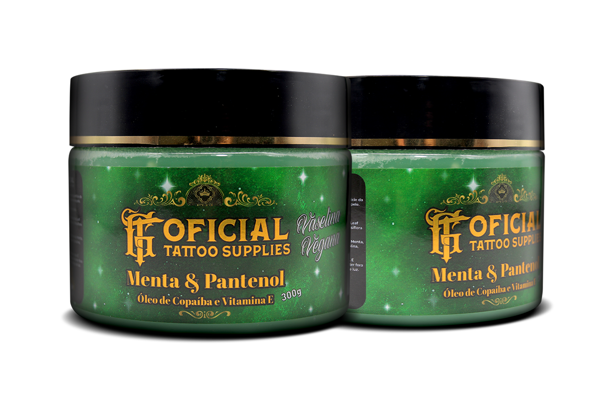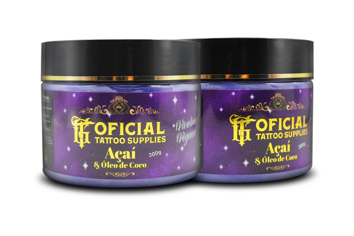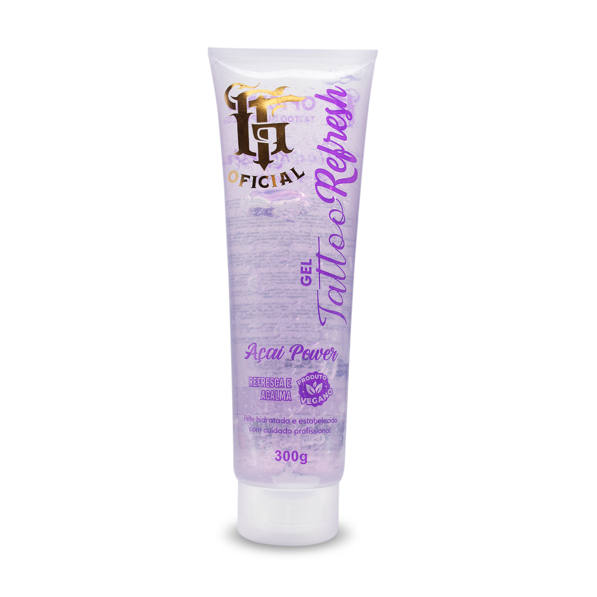 Gel refrescante com extrato de açaí, aloe vera e pantenol, acalma, hidrata e auxilia na recuperação da pele, proporcionando conforto durante e após a tatuagem.