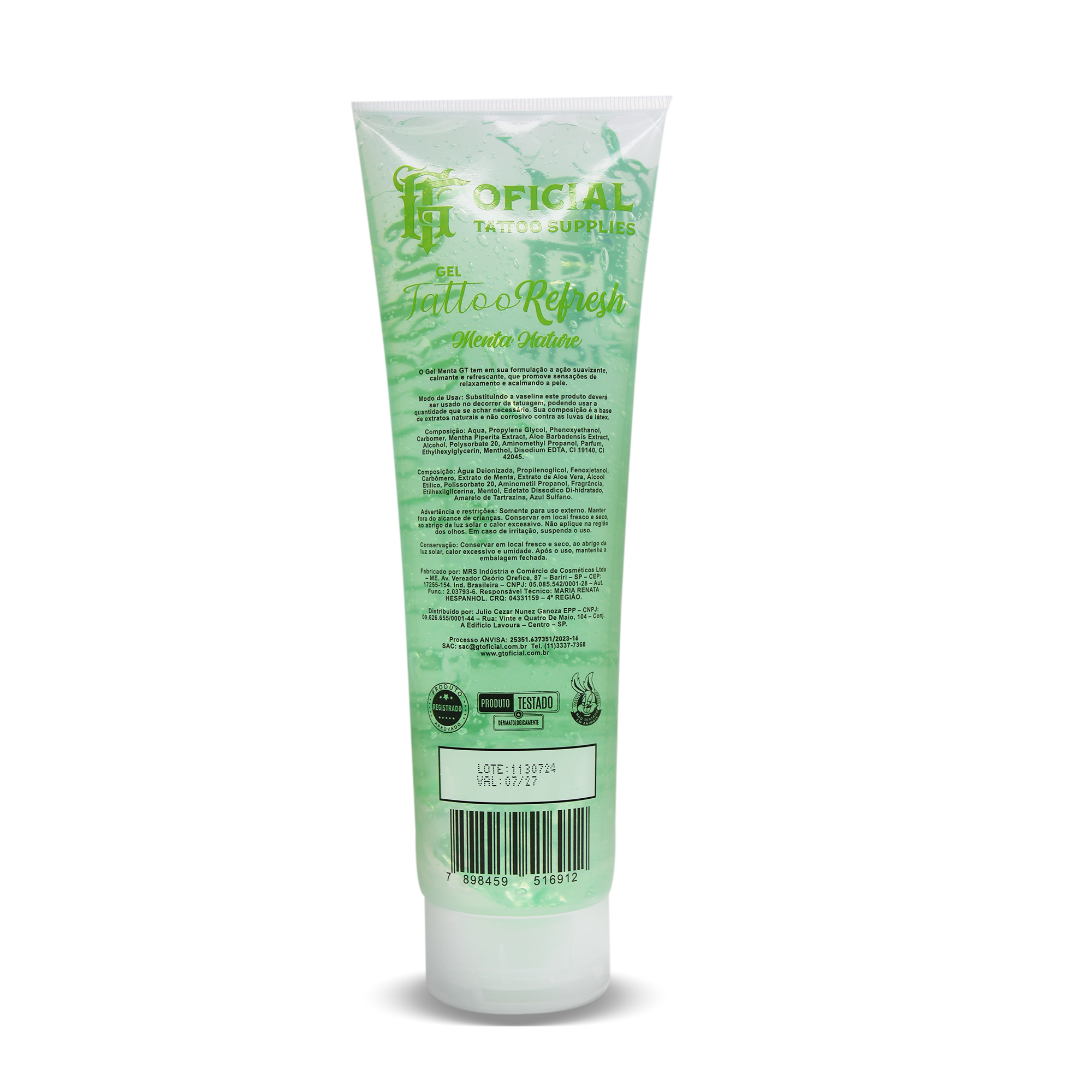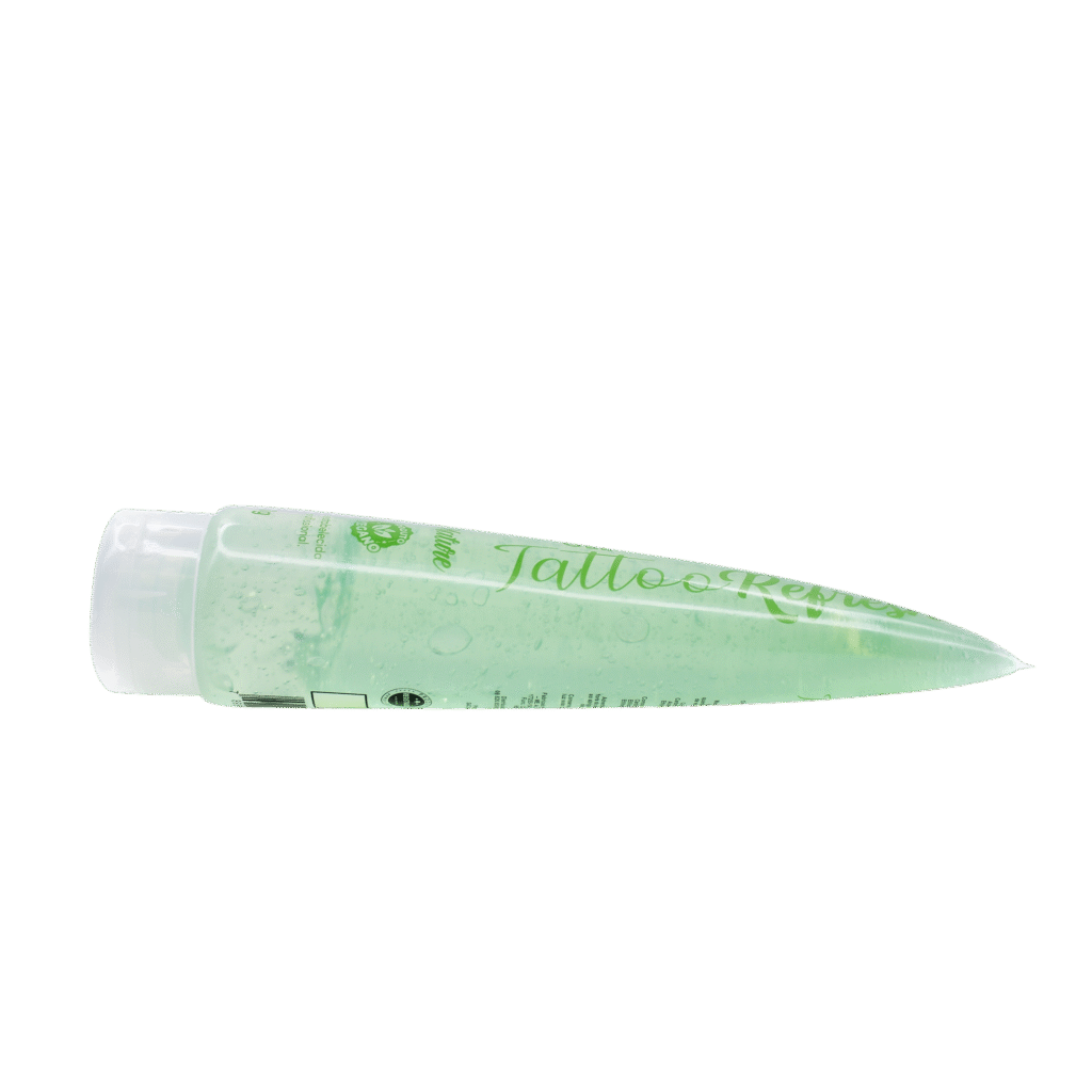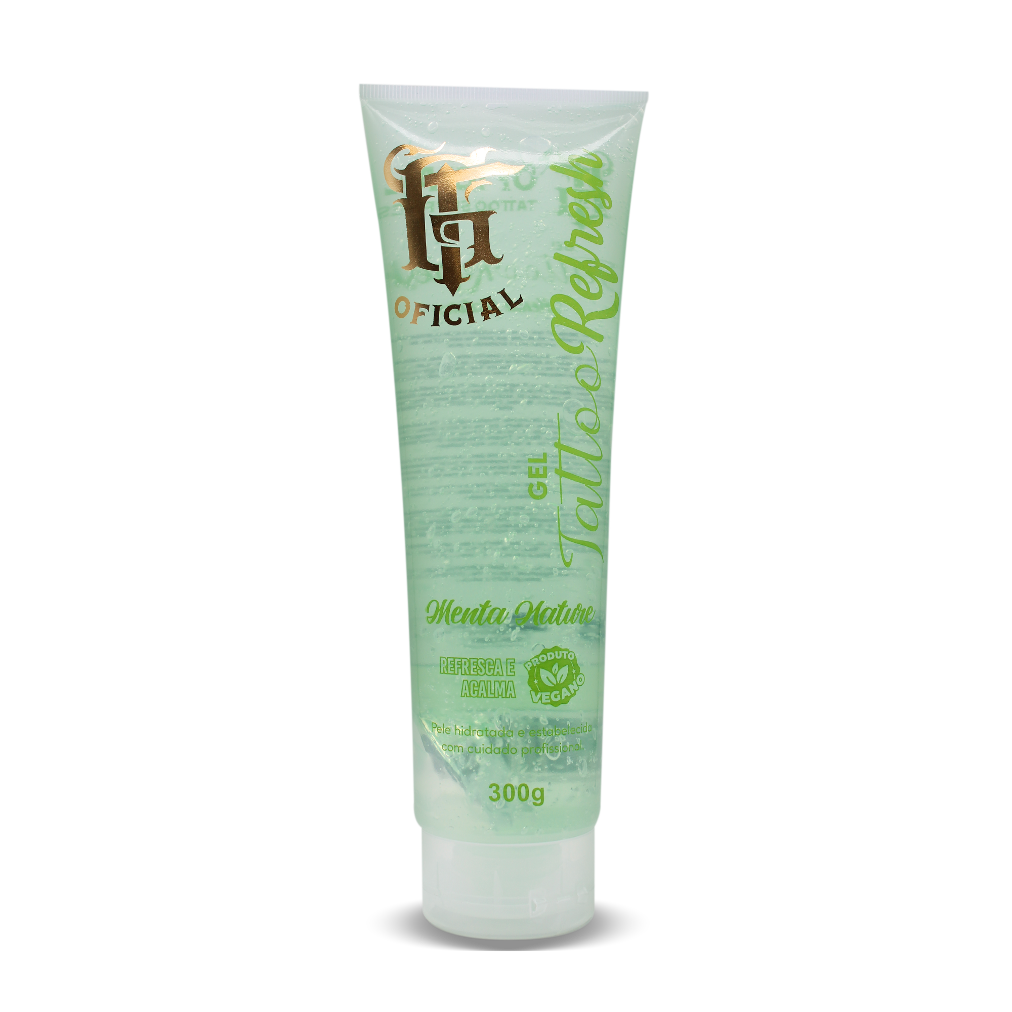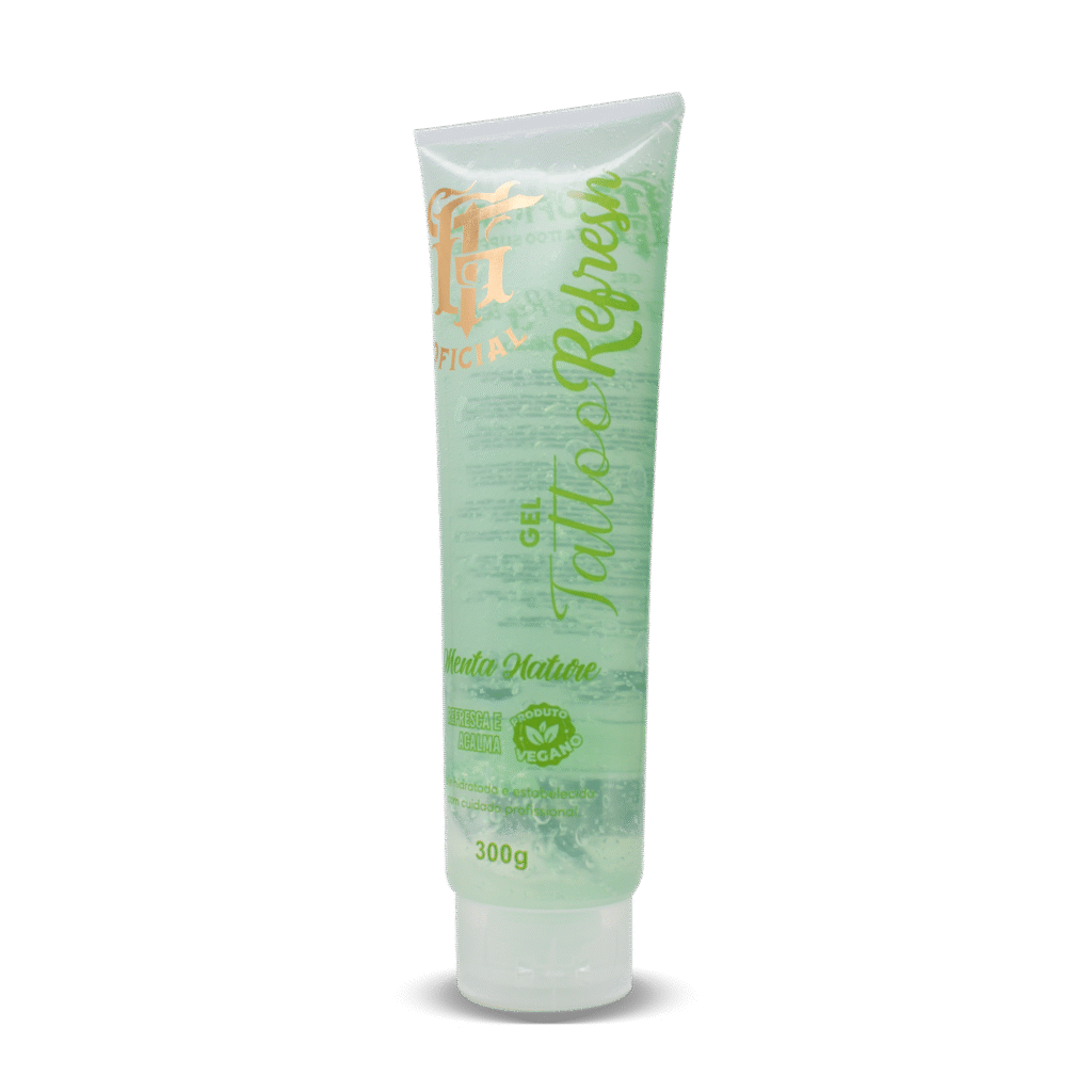 Gel refrescante com extrato de menta, aloe vera e pantenol promove efeito calmante, refrescante e hidratante, ideal para o cuidado da pele durante e após a tatuagem.