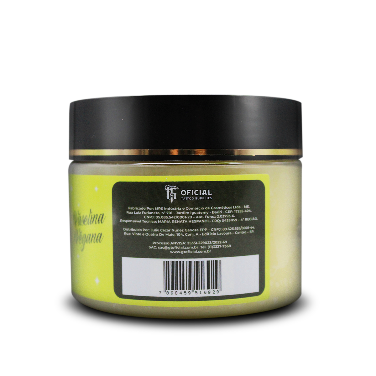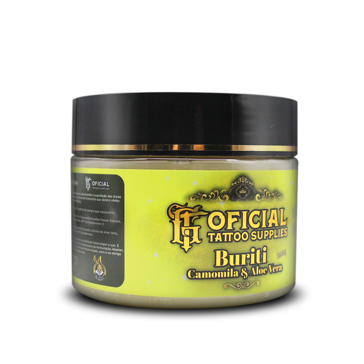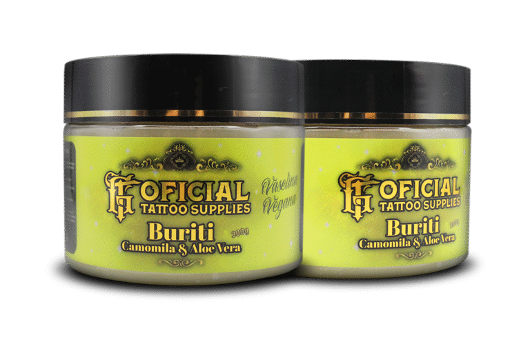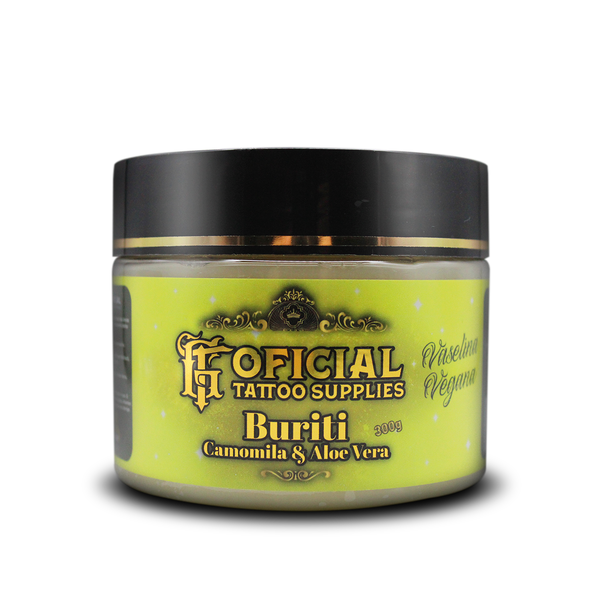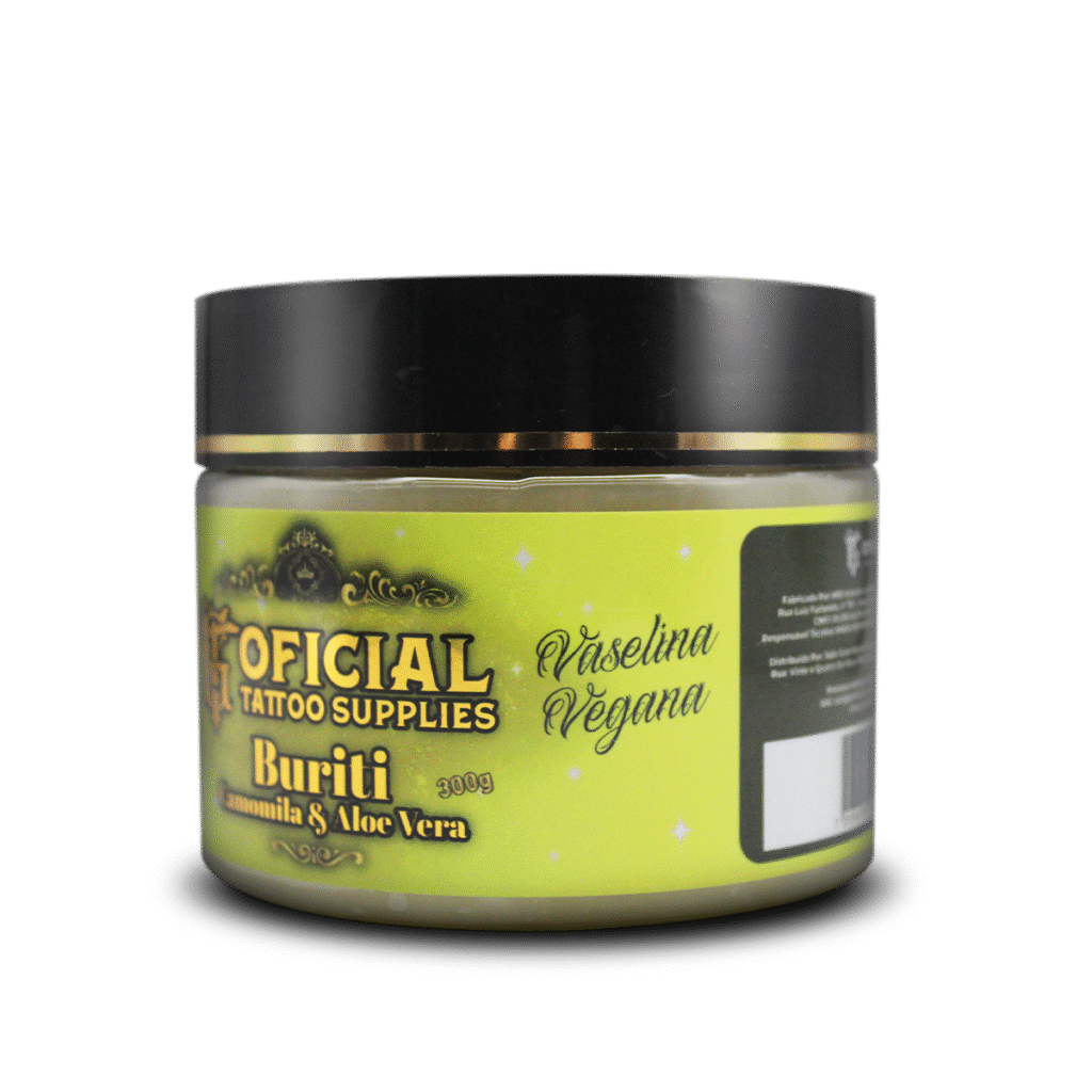 Vaselina vegana com óleo de Buriti, camomila e aloe vera, promove deslize ideal, hidratação profunda e ação calmante, ideal para procedimentos de tatuagem.